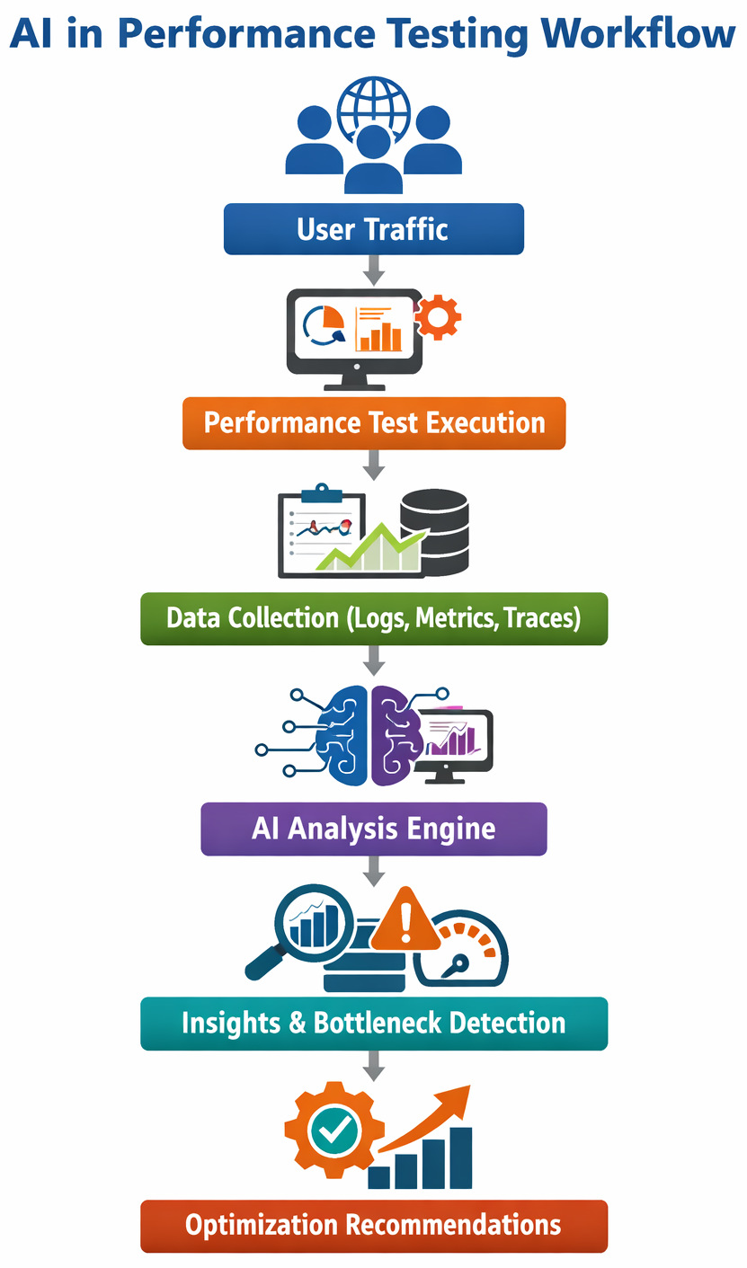 A: Traditional performance testing relies heavily on manual scripting, log analysis, and repeated test execution. AI enhances this process by automating several stages of the testing workflow.