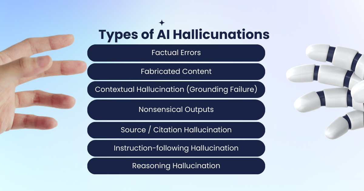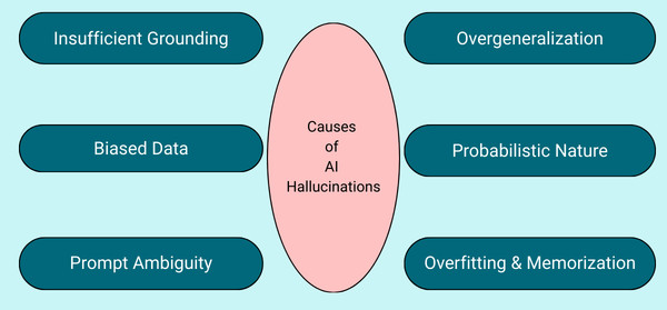 - Insufficient Grounding: Models generate answers solely based on what they are trained on. If the context is incomplete or ambiguous and without references to current events or knowledge bases, it will give rise to hallucinations.