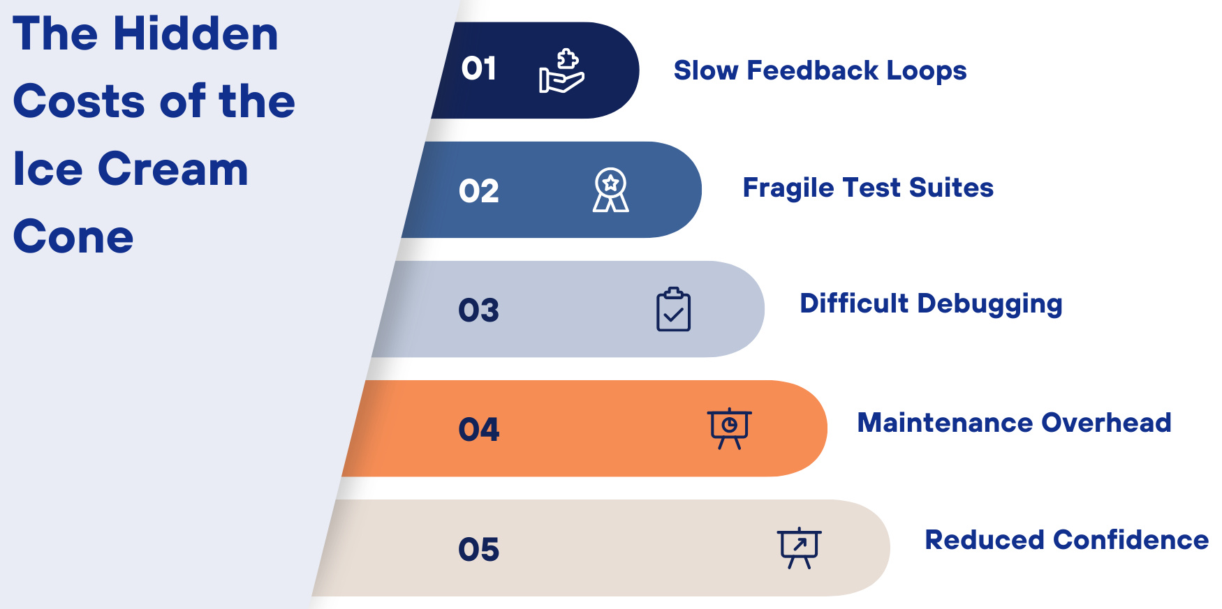 The Ice Cream Cone Model poses structural and operational risks that are cumulative over time. It is an imbalanced approach that slows the pace of development, induces instability, and lowers the overall confidence in the test suite.
