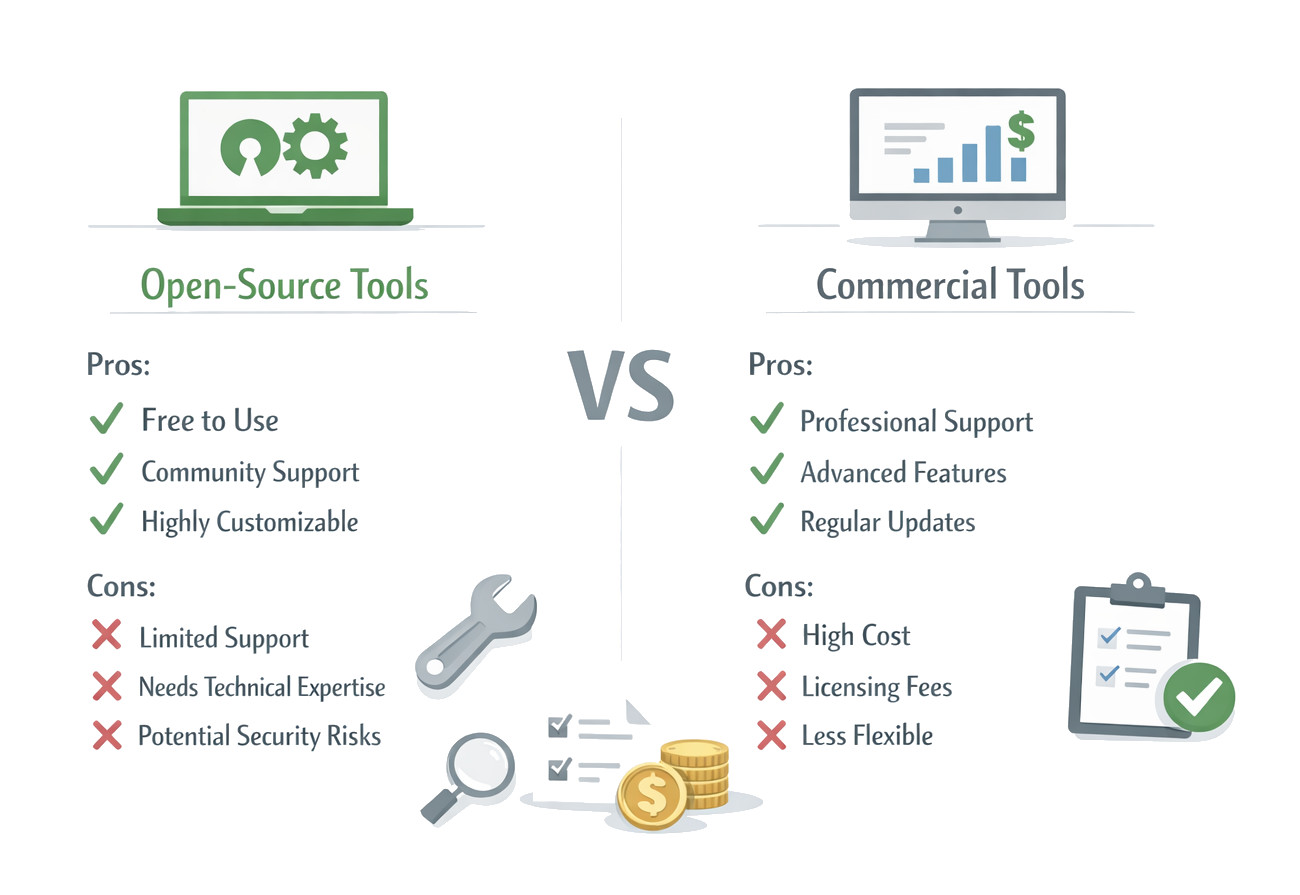 - Commercial tools are ideal for enterprises that require advanced features, support, and scalability.