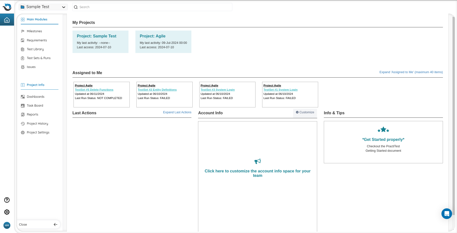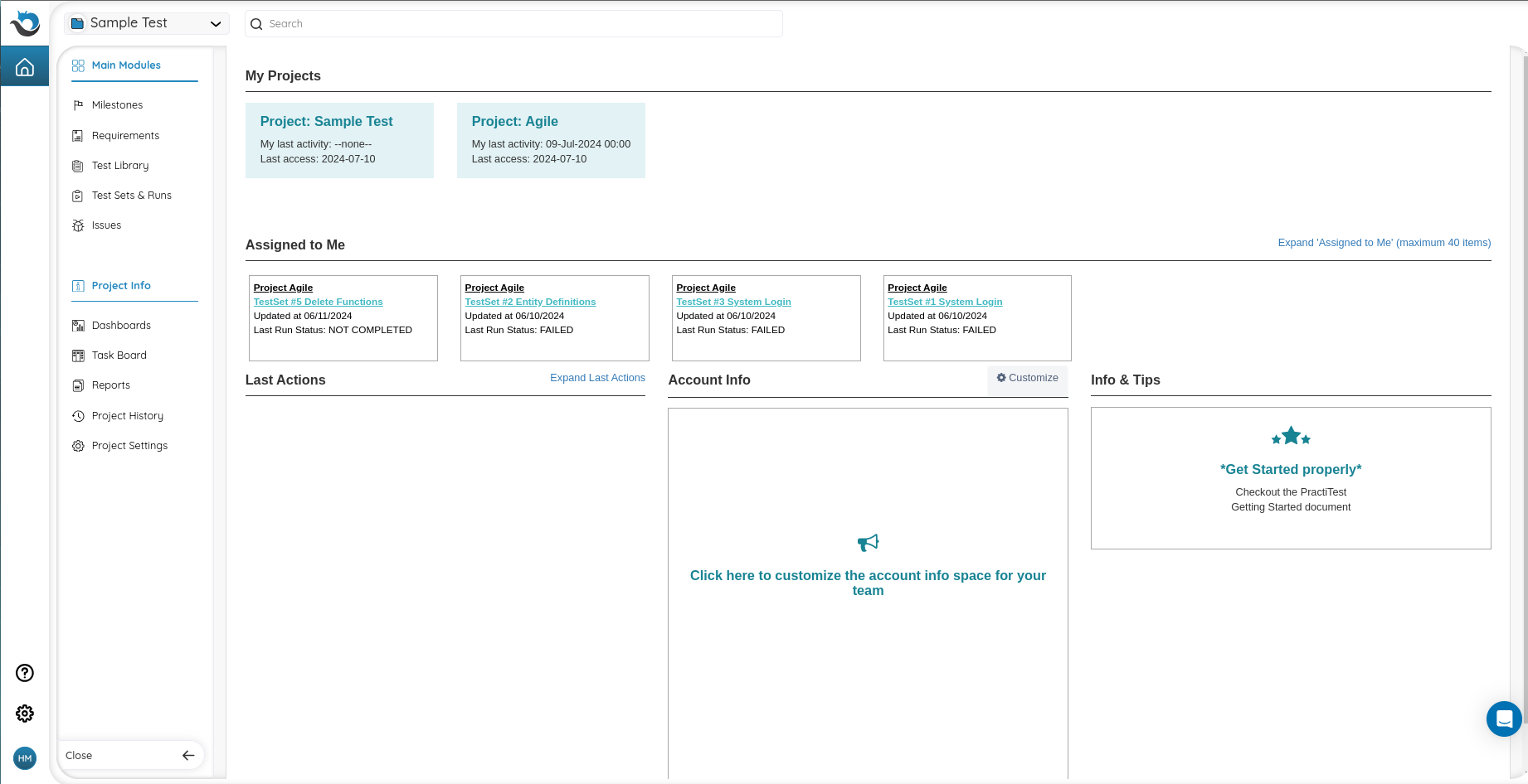 Once you log in to PractiTest, the home page will be displayed with details of the project and tasks assigned to the user. The left-side menu contains links for milestones, requirements, test library, test sets and issues. It also has links for dashboards, reports, task boards, etc.