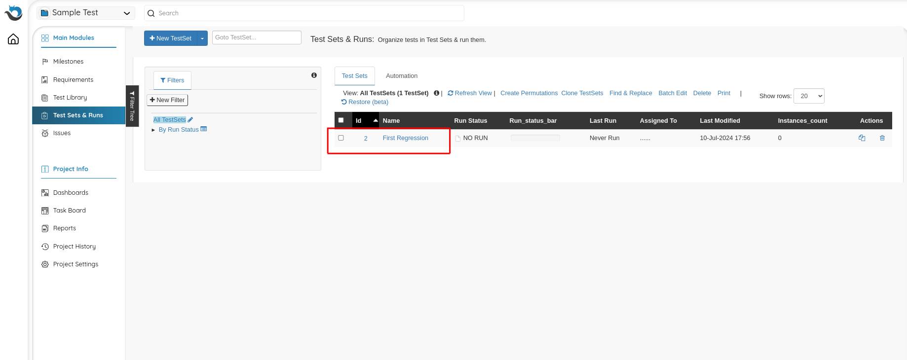 Step 8: We can see the created Test Set in the Test Sets & Runs link.