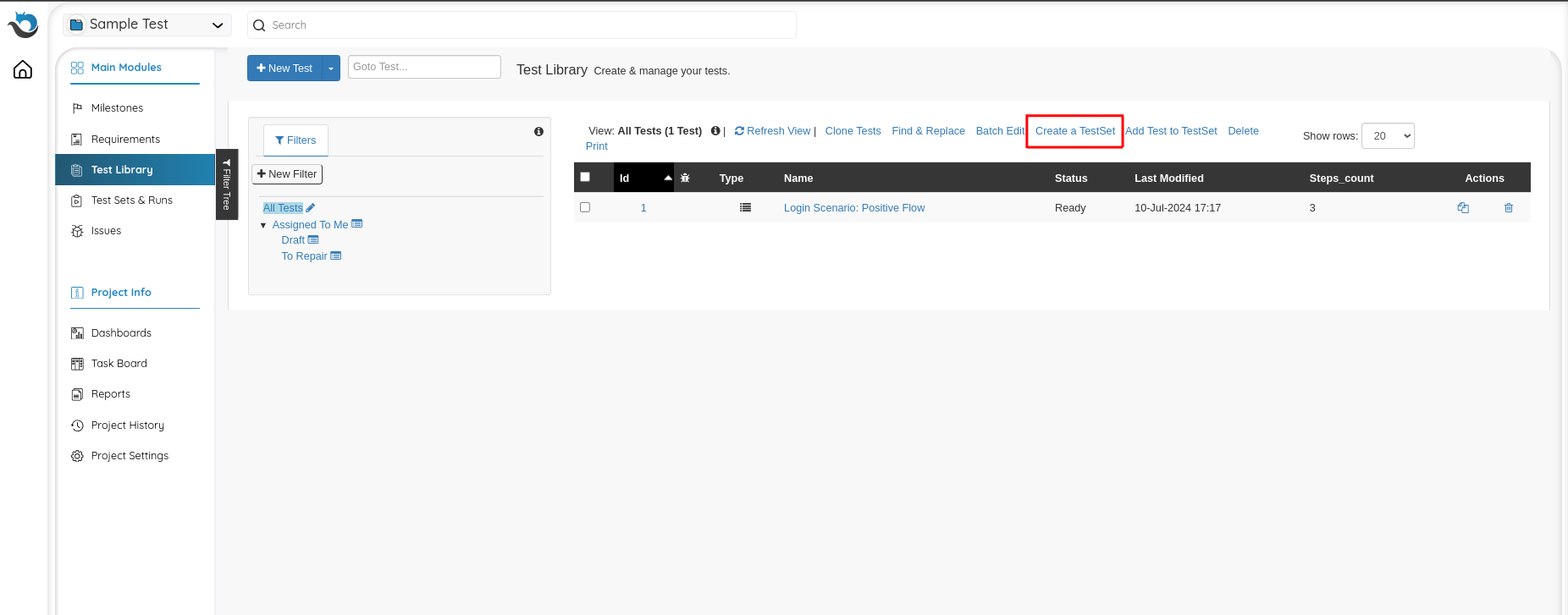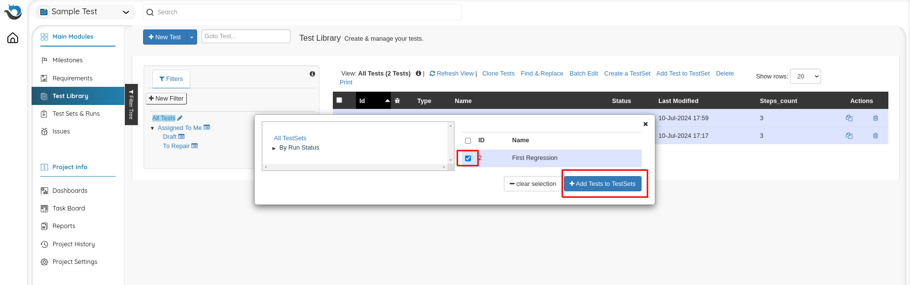 Step 9: Now, let’s add test cases to the test set. To do that, go to the Test Library, Select the test cases you want to add and click Add Test to Test Set.
