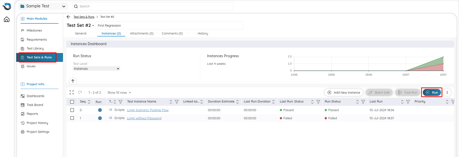 Step 11: Go to Test Sets & Runs and click Run to run the test sets. You can update the test results for each test case.