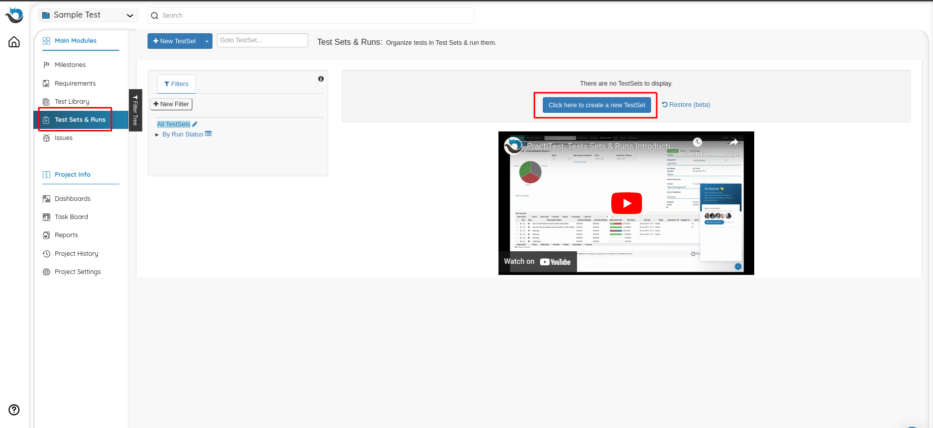 (ii) The second option is from Test Sets and Runs. Click it and then click Click here to create a TestSet.