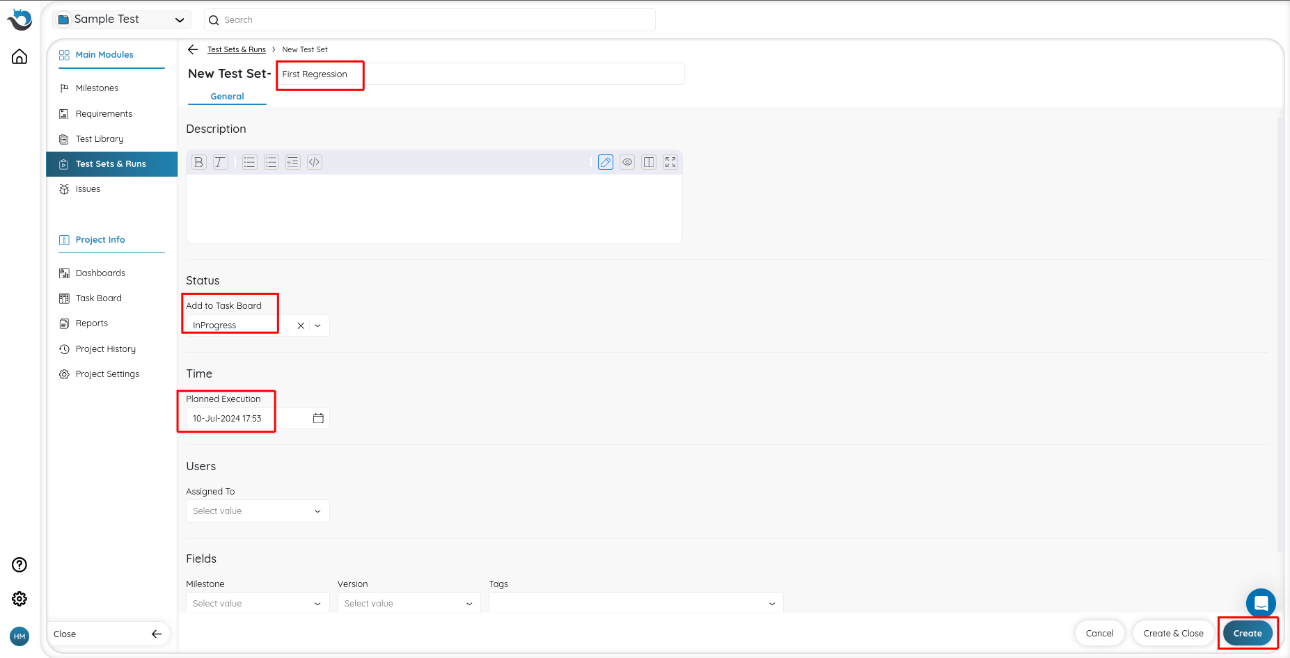Step 7: After clicking Click here to create a TestSet button, you will see a new page to create a Test Set. Add the test set name and planned execution date and click Create.