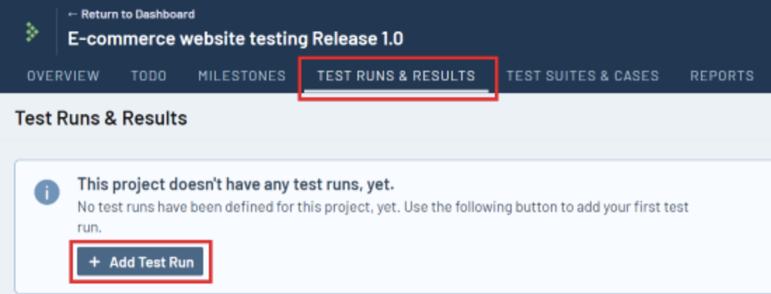 Step 1: Navigate to the TEST RUNS & RESULTS tab, and click ‘+ Add Test Run‘.