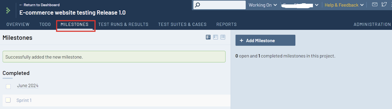 Milestone: Add project milestones (such as software releases) to TestRail to manage and track multiple test runs for a single milestone, as shown below:
