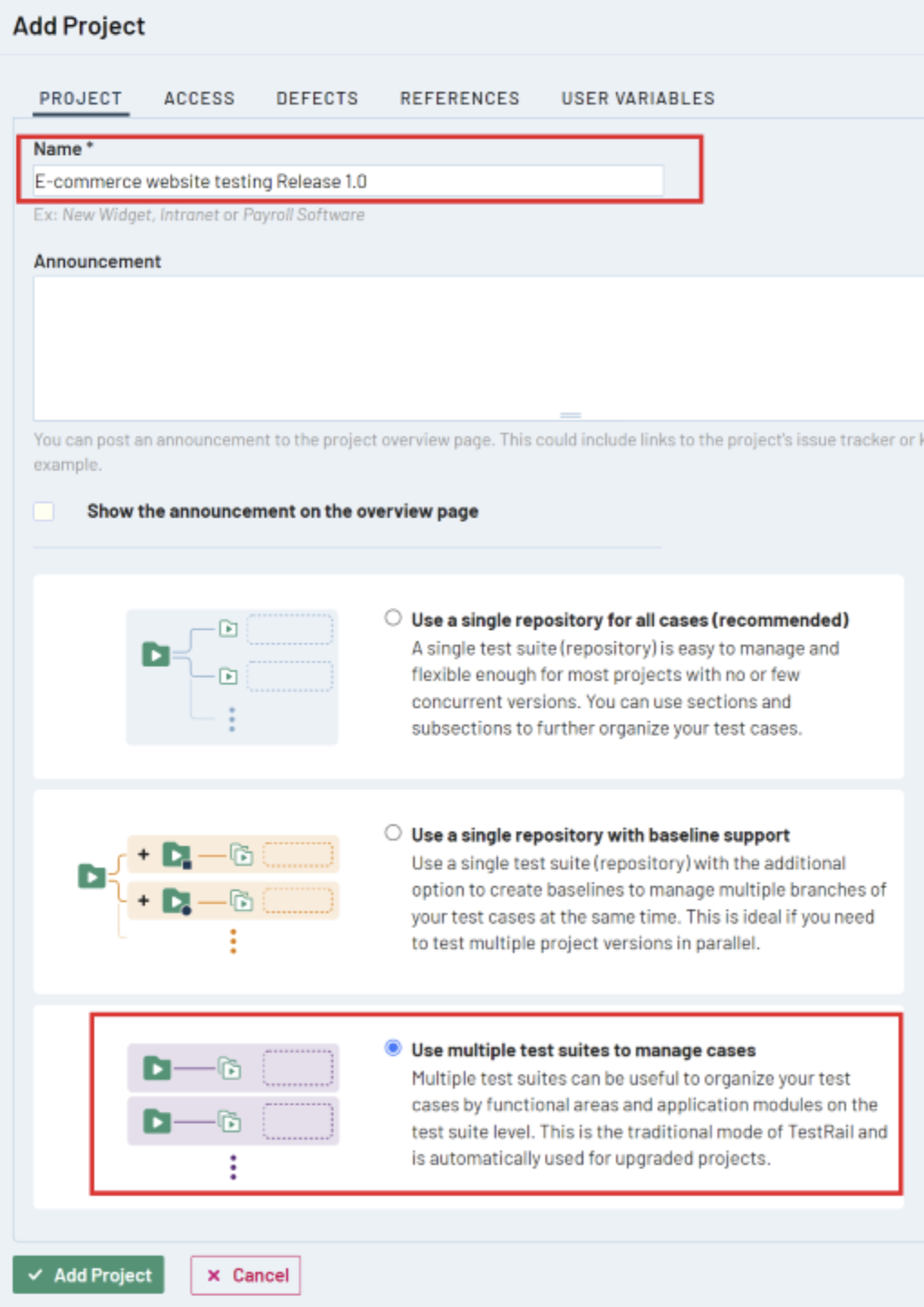 Step 2: Provide a project Name and select a repository type from three options. Then click Add Project.