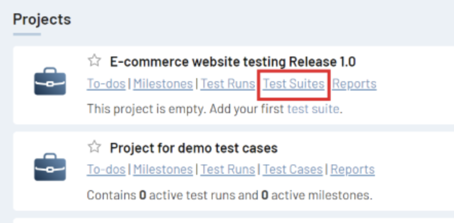 Step 1: Click on the DASHBOARD tab. You will see all existing projects. Under the newly created project name, click Test Suites.