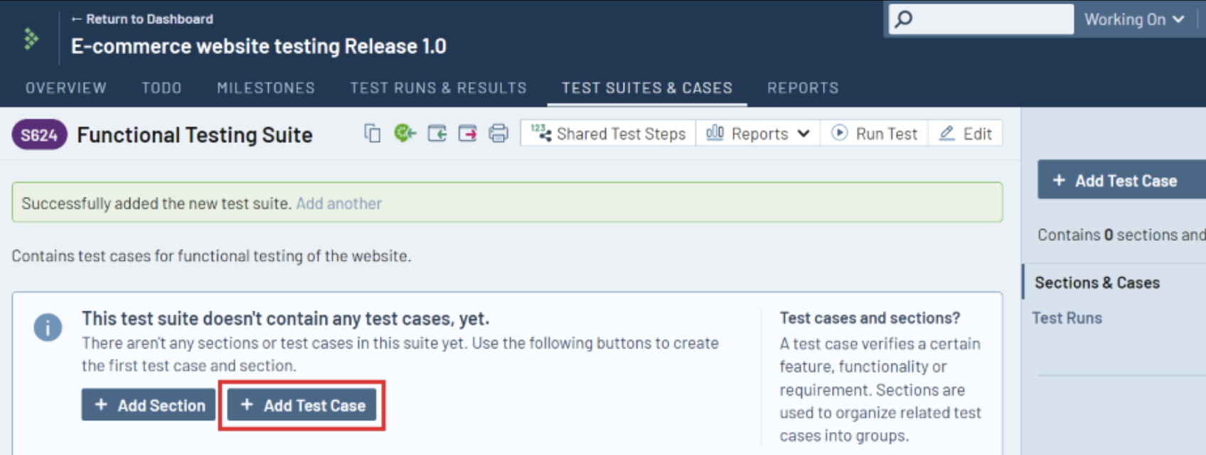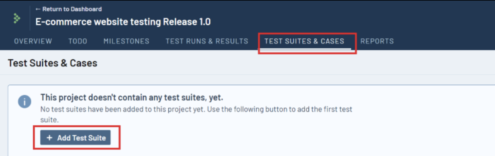 Step 2: You will be navigated to TEST SUITES & CASES tab, click ‘+ Add Test Suite‘.