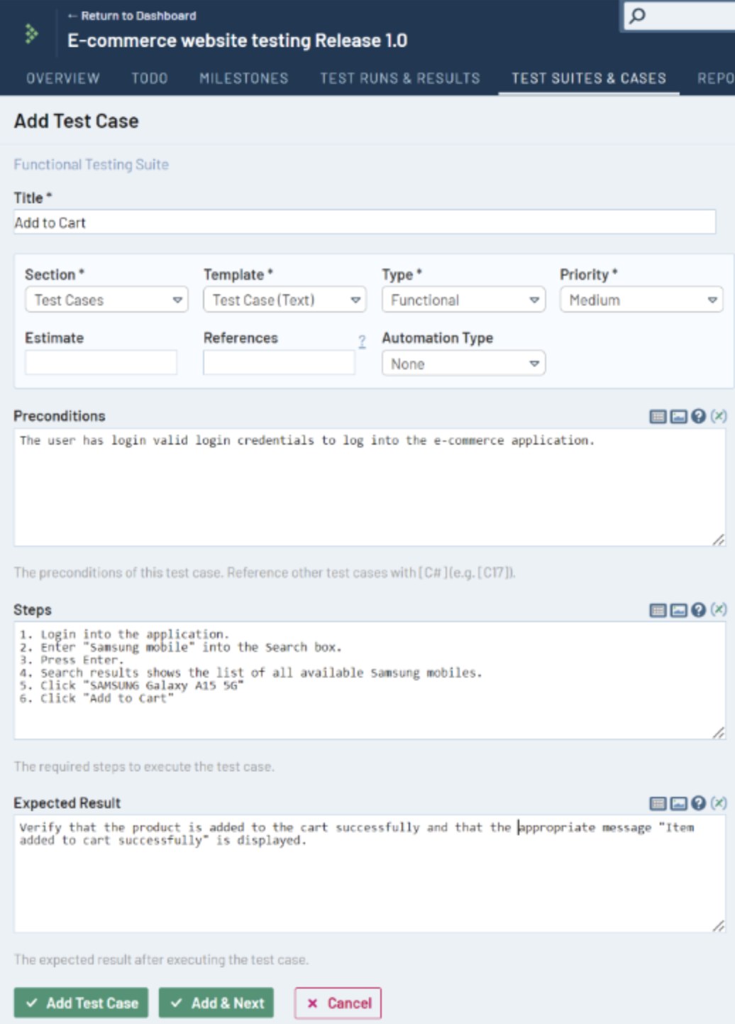 Example: A large enterprise with multiple development teams working on different modules of a CRM system uses TestRail to manage their test cases. Each team can create and organize their test cases in separate test suites. But all test cases are stored in the same repository. This centralization ensures consistency, easy access, and better coordination across teams.