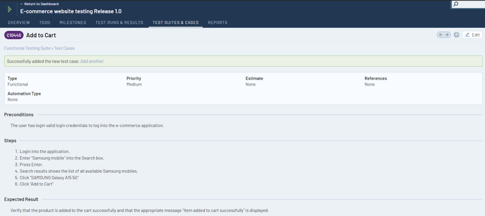Step 3: Click Add Test Case, to add the new test case. You will see a message and newly added test case on the screen.