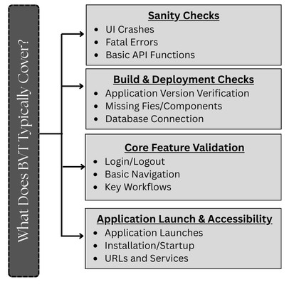BVT focuses on critical, high-priority areas that define the core functionality of the application, and not exhaustive testing. The exact scope varies depending on the application, but common checks include:
