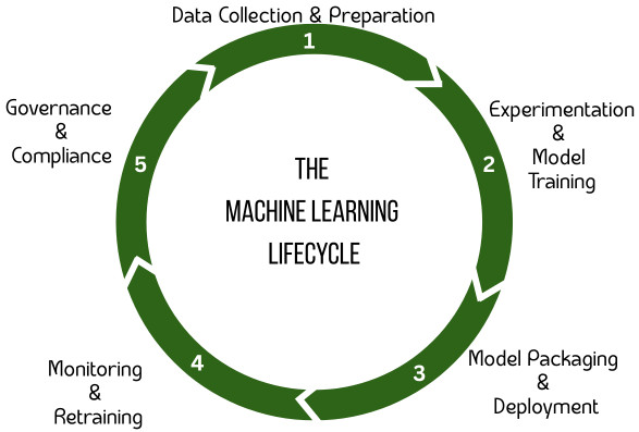 The machine learning lifecycle begins with data preparation. Data of different types is retrieved from various sources, and activities such as aggregation, duplicate removal, and feature engineering are performed. Data is validated, and quality checks are performed on it in addition to storing datasets in versioned repositories. Metadata tracking is also performed for datasets.