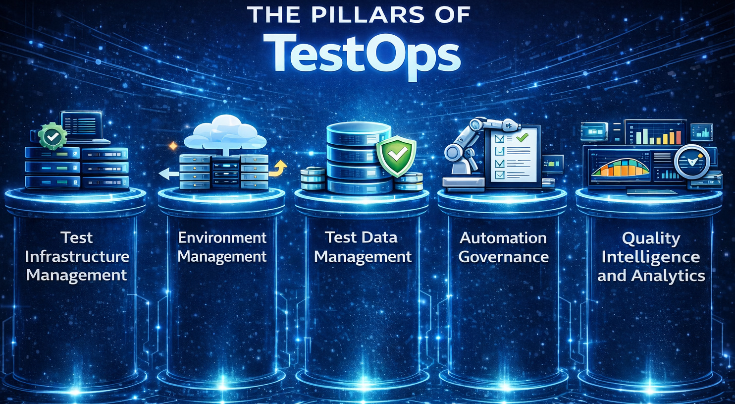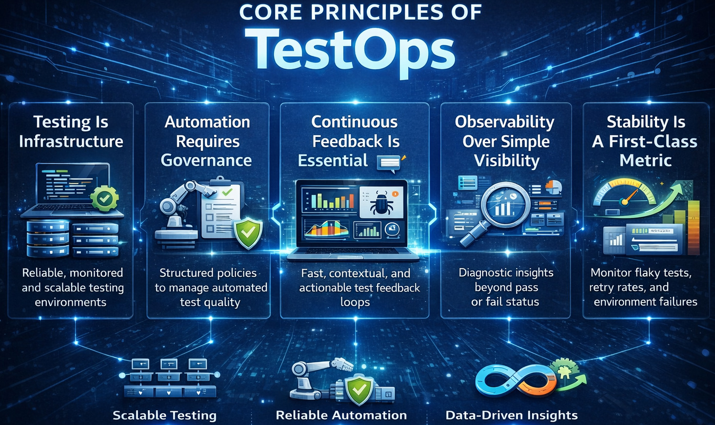TestOps is structured around foundational pillars that ensure testing operates as a reliable, scalable, and intelligent system. These pillars collectively transform automation from isolated scripts into a governed, observable, and continuously optimized ecosystem.