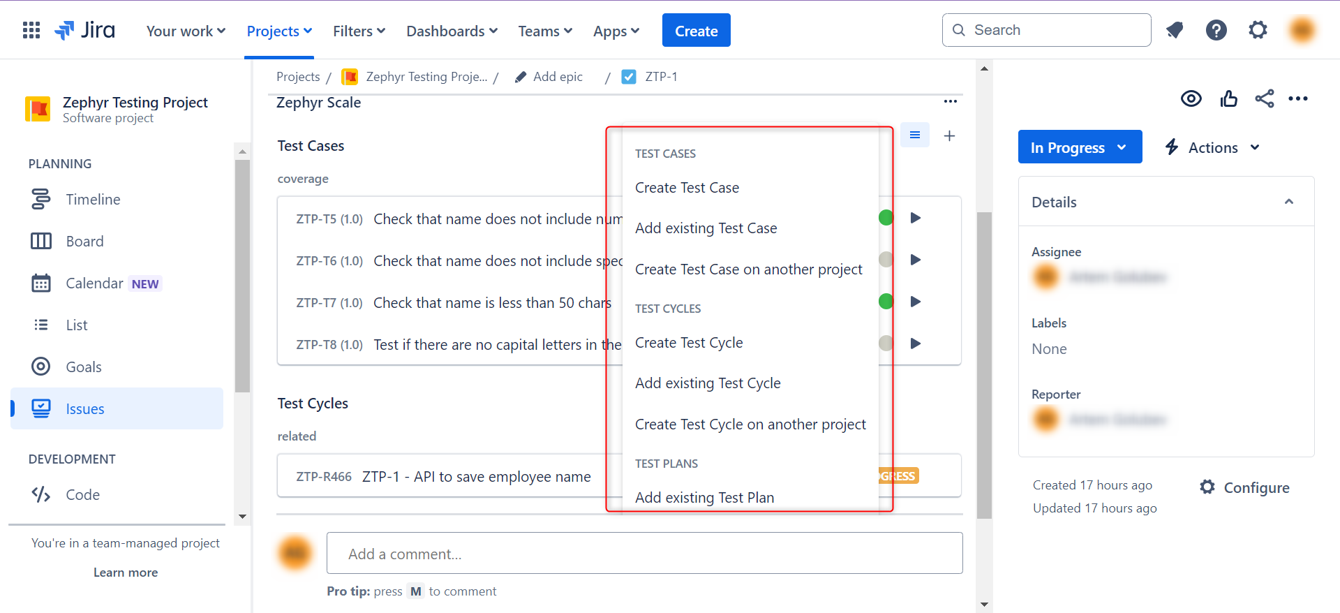 After you’ve added the test cases through either of the methods, you’ll see them populated in the Zephyr Scale section below the task Description.